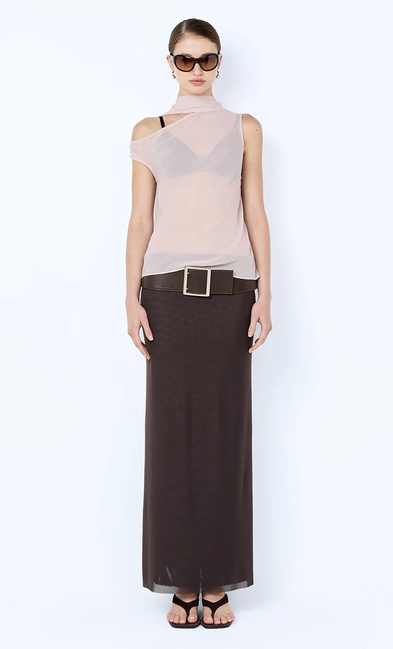 Augustin Scarf Top in Mauve. A delicate single-layer georgette top featuring an asymmetric neckline and sheer finish, styled with a chic neck scarf for a sophisticated, elevated look.