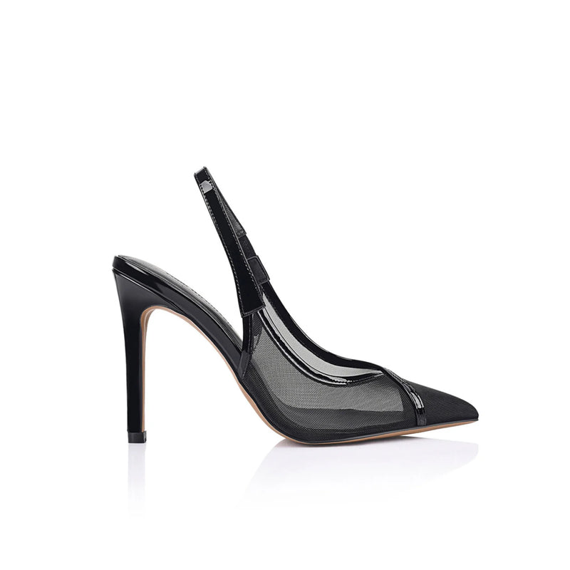 Modern, minimal, and effortlessly sultry, Chai in black mesh is a striking silhouette made for after-dark dressing. Featuring sheer mesh panelling and glossy patent accents, this slingback design adds just the right amount of edge. Its pointed toe and stiletto heel create a sleek, elongating effect that complements everything from tailored suiting to statement evening wear.