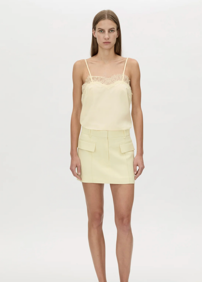 CAMILLA AND MARC Eryn tailored lemon yellow mini skirt with pintucks down centre front. Jet pockets with contrast internals. Concealed centre front fly opening.