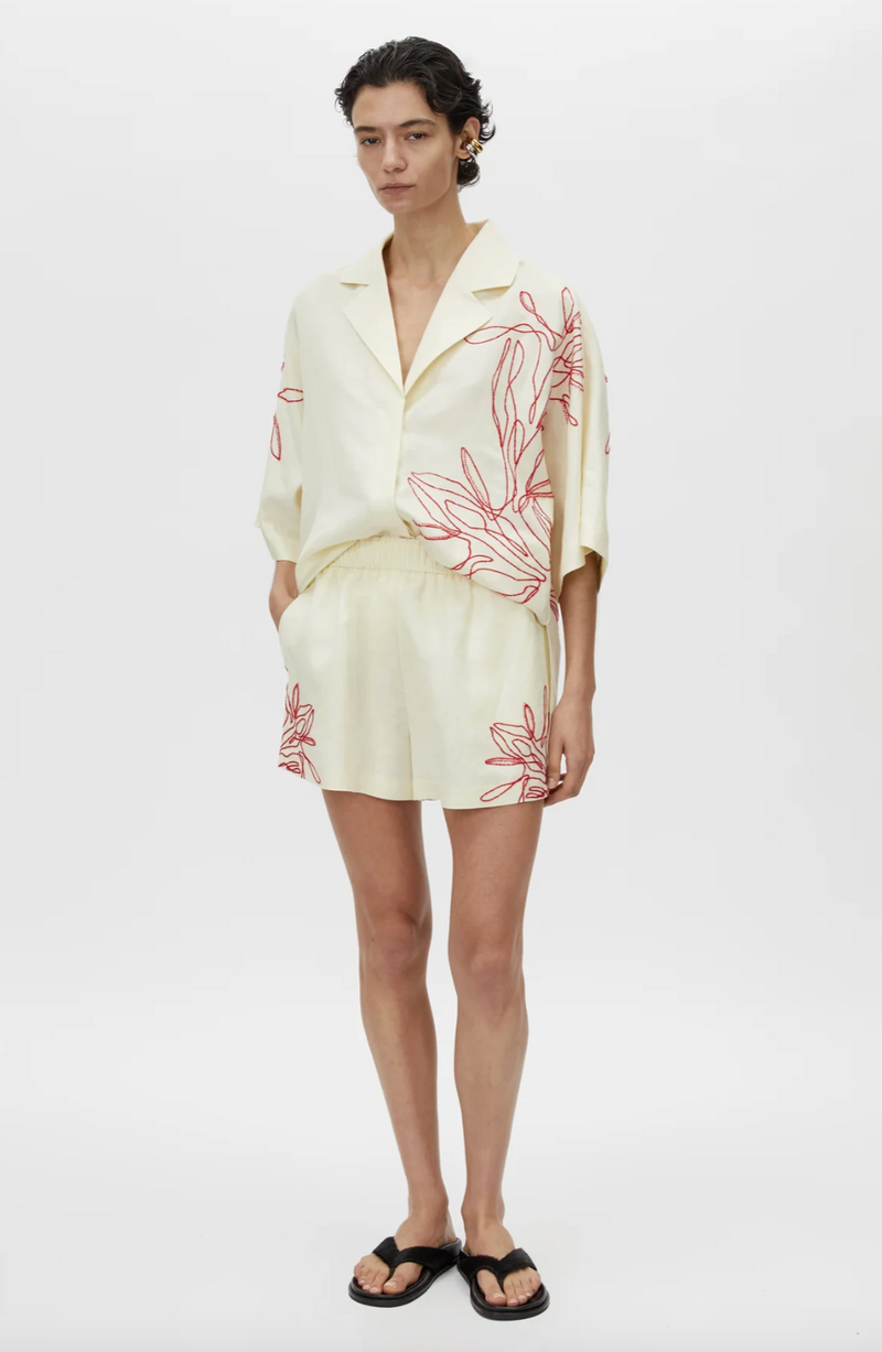 CAMILLA AND MARC Eviva lemon yellow short with beaded chainstitch embroidery down outer leg. Elasticated waistband for adjustable fit. Inseam side pockets, blind hem.
