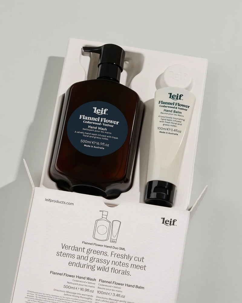Verdant and velvety Flannel Flower Hand Wash 500mL & Balm 100mL is reimagined with the conceptual artwork of Sydney-based artist Mark Gowing.
