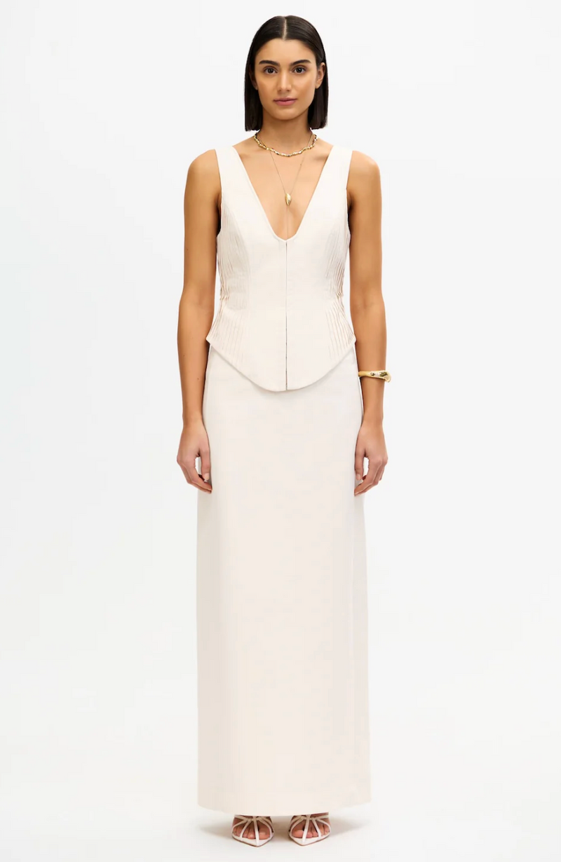 The Malton Maxi Skirt in Sandstone redefines modern tailoring through a sculptural lens. Crafted from heavyweight cotton, this full-length skirt features a defined silhouette and back vent for ease of movement. The fully lined construction and seamless side zip ensure a refined finish, making it an elevated option for occasion or event dressing.