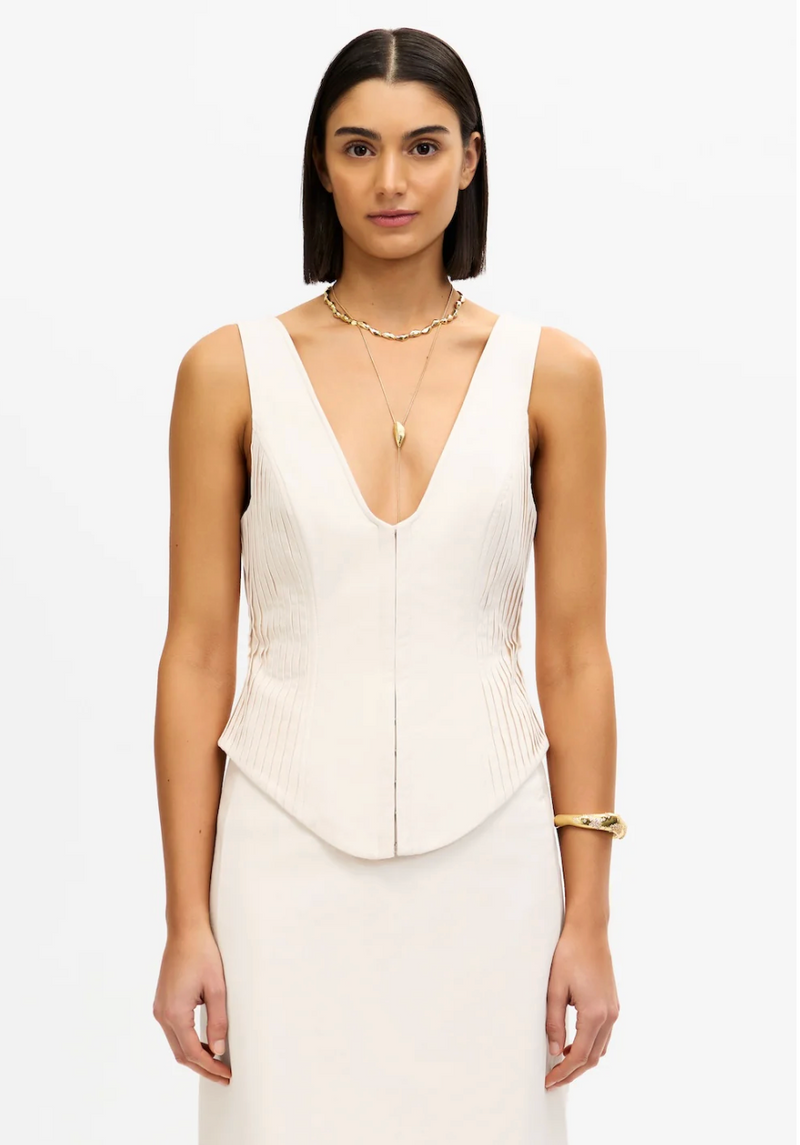 The Matson Top in Sandstone is a study in modern structure and refined craftsmanship. Tailored from heavy woven cotton, this fully lined piece features sculptural side seam panelling and striking large silver hook and eye closures at the centre front. Its clean lines and architectural detailing offer an elevated interpretation of staple dressing, perfectly suited for sophisticated event styling.
