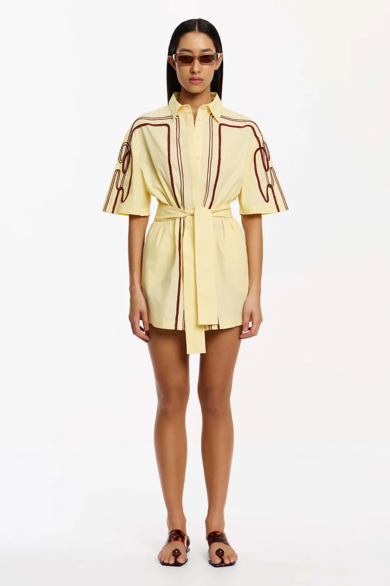 The Morrigan Mini Dress in Lemonade captures Significant Other's signature blend of ease and artisanal detail. Crafted from woven cotton shirting, this silhouette features a concealed button placket and an adjustable tie belt, allowing for a waisted finish. Embroidered accents and in-seam pockets add refined utility, while its slightly sheer fabrication lends a modern, lightweight appeal‚ perfect for warm weather occasions.